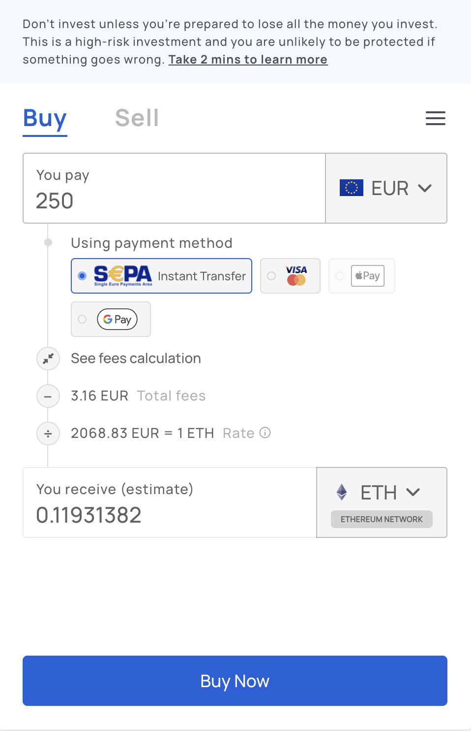 THEN: The Transak Widget will be loaded with EUR as the default fiat option.
