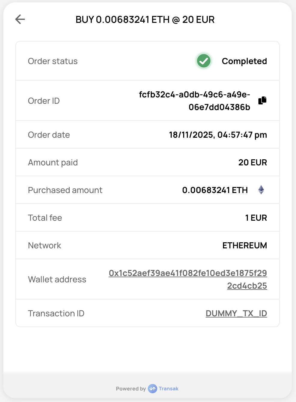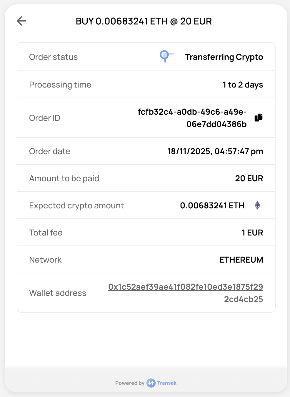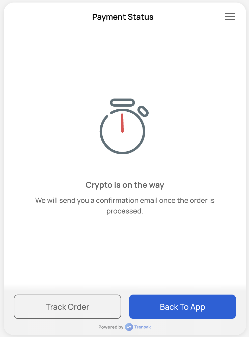 ![]() | ORDER_PROCESSING | PENDING_DELIVERY_FROM_TRANSAK | When the payment is received and reconciled and we have initiated fiat transfer to the user. |