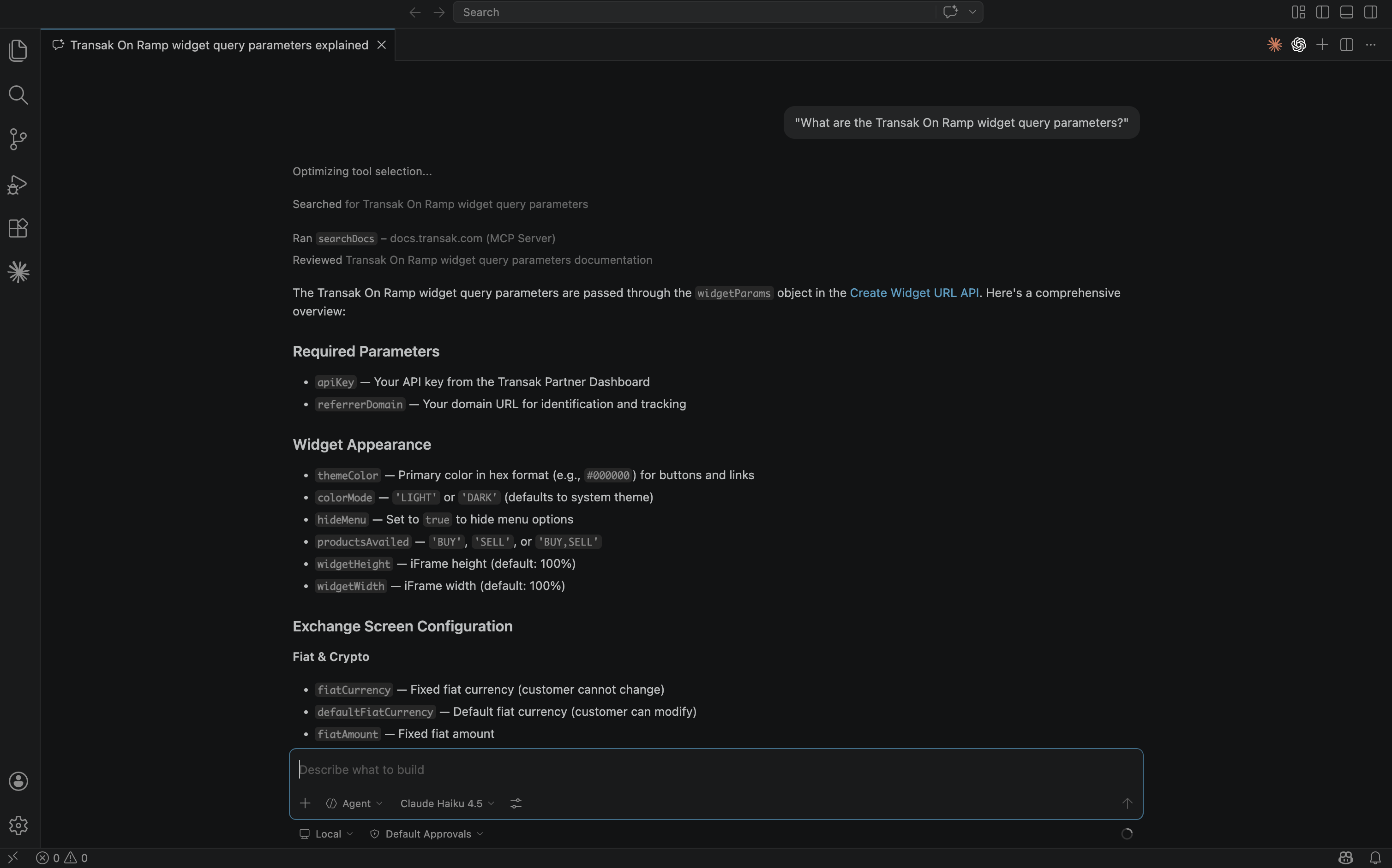 The Model Context Protocol (MCP) lets AI-powered coding tools query external knowledge sources directly from your editor. Transak exposes its full documentation as an MCP server. Once connected, your IDE can answer questions about the Transak API, integration options, query parameters, webhooks, and more without you leaving your IDE.