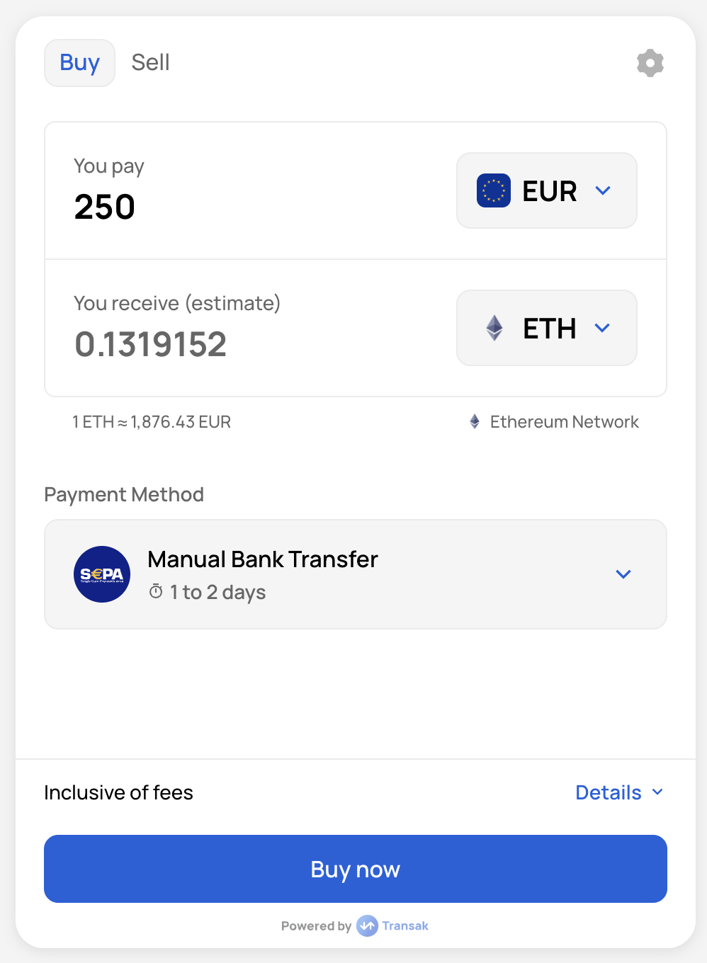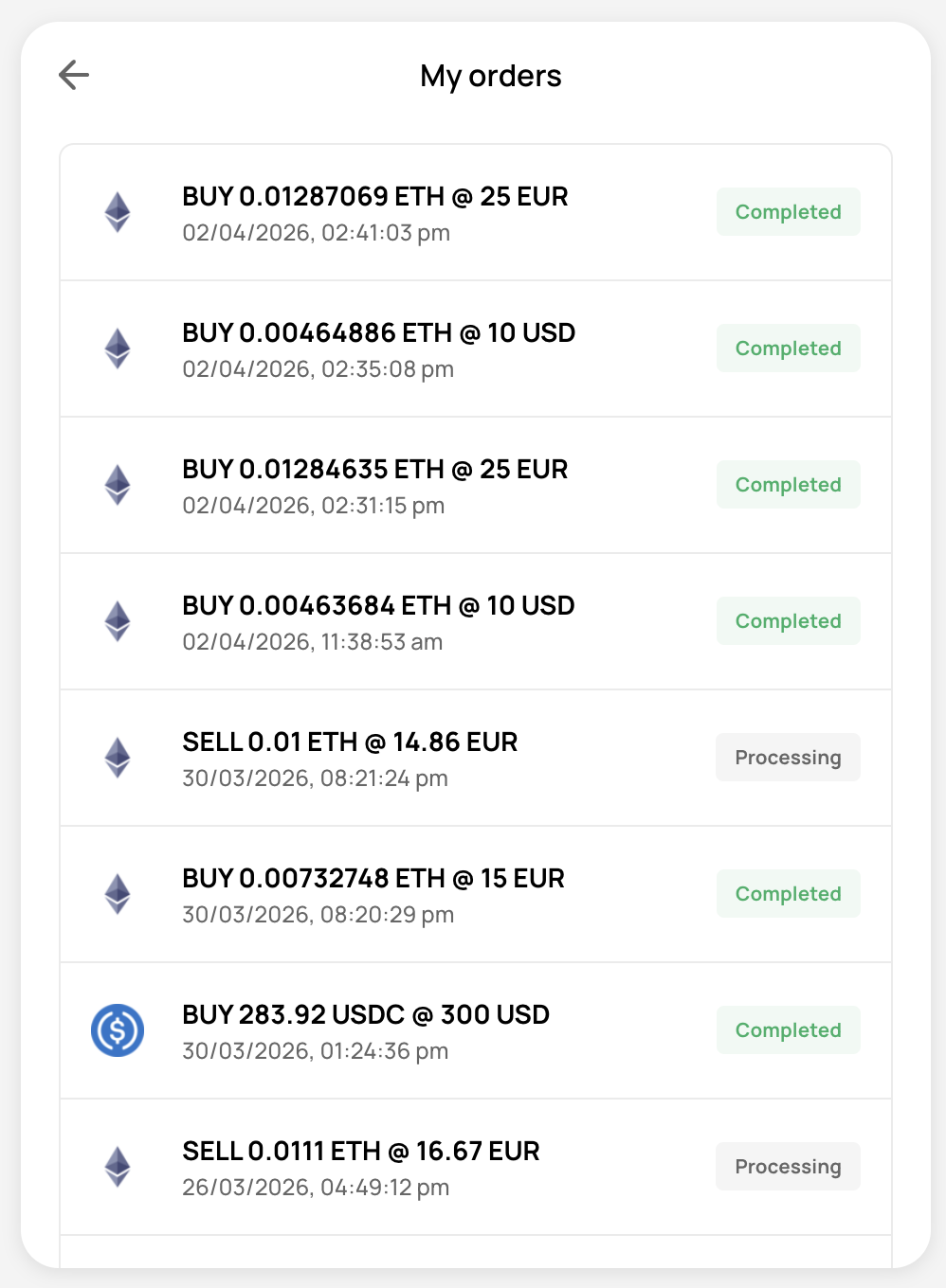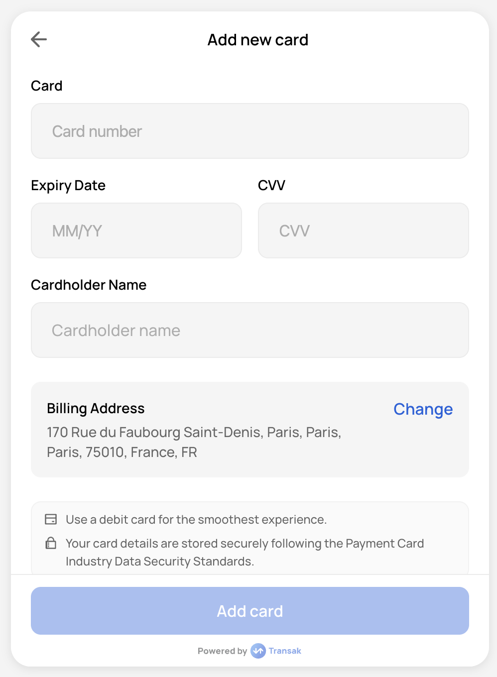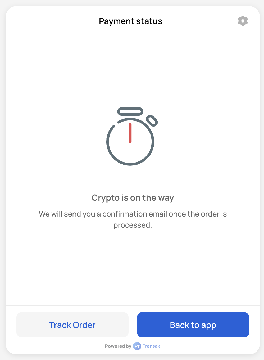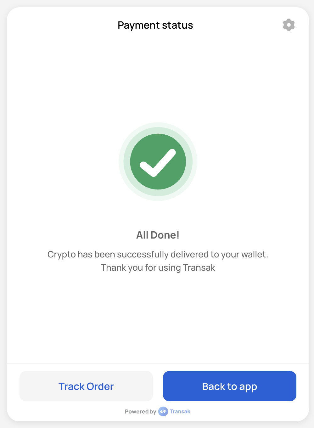 To skip this step, continue the user journey in your own application by listening for the TRANSAK_ORDER_SUCCESSFUL event after payment is initiated.